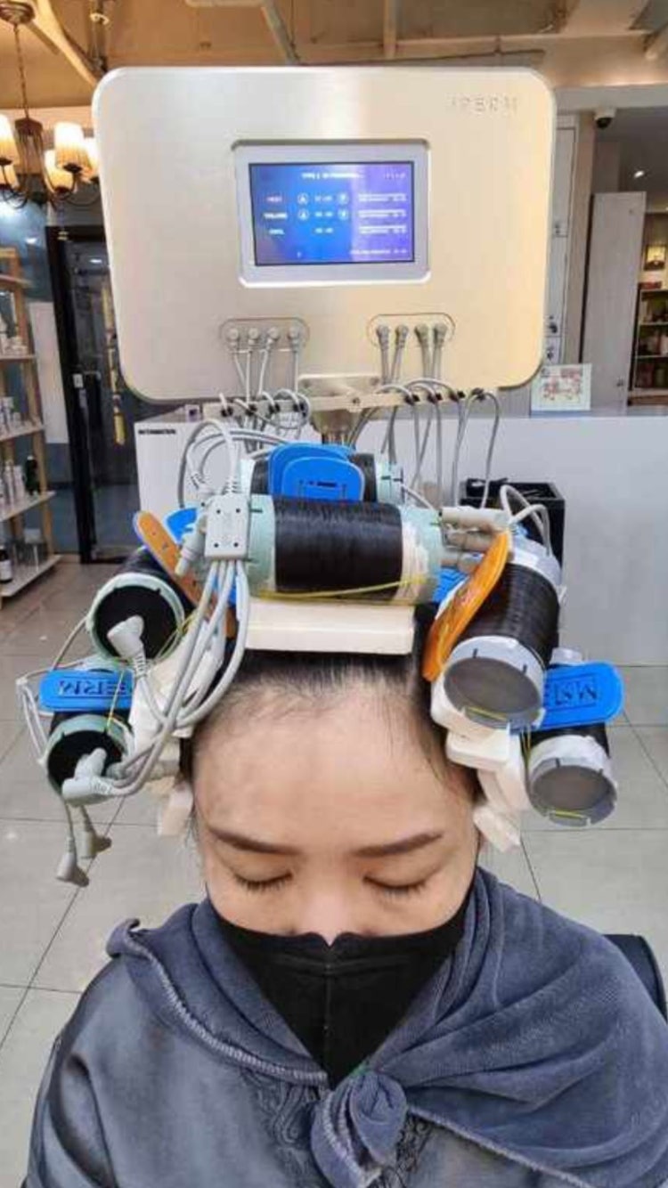 iPERM 기계는 천연 보습성분과 세계 최대 굵기의 43mm, 38mm, 33mm 파마롯드로 앞머리펌, 옆머리 볼륨펌, 뿌리 볼륨펌, 레이어드펌을 한번에 하므로 시술시간이 짧고 추가비용이 없으며 모발손상이 거의 없어요